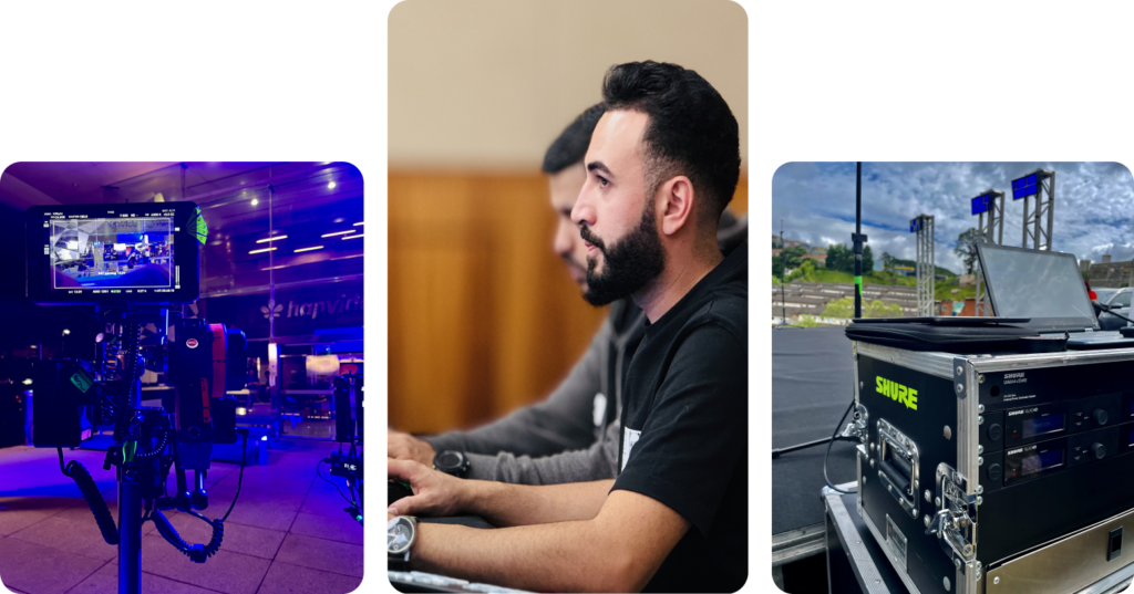 Nós utilizamos somente equipamentos de ponta e tecnologias avançadas, como painéis de LED de alta definição e sistemas de projeção de última geração. Este compromisso com a modernidade e a qualidade assegura que cada detalhe do seu evento será perfeitamente executado.